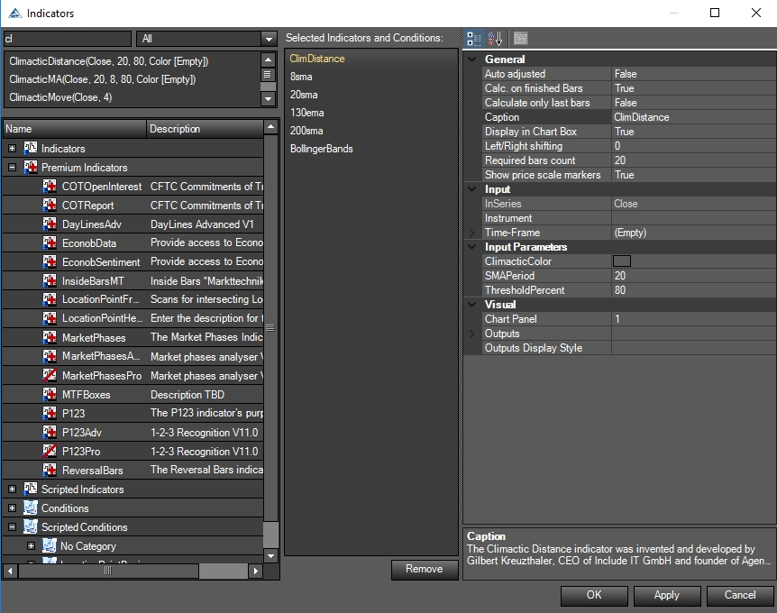 Normally, when making comparisons within the ConditionEscort, the data series generated by indicators are used. One such example would be checking whether a moving average lies above or below a specific price value. An indicator can also yield values that are not contained within data series, such as values of the type int, double, char, Boolean, string, etc. To use these values within the scanner or ConditionEscort, they have to be labeled with the conditional value attribute.